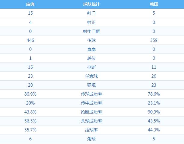 韩国队战术失效点: 韩国队最大的问题在于攻防两端的“脱节”。在瑞典的高位压迫下,韩国中后场出球极为困难,只能被迫频繁大脚解围,导致前场的孙兴慜几乎得不到有效支援。全场仅2次射门的数据暴露出韩国进攻体系的全面瘫痪-。申台龙排出的4-4-2阵型在中场控球环节完全落于下风,上半场控球率不足四成的被动局面未能得到有效改善。新帅的防守反击体系在瑞典高强度的持续压迫面前显得水土不服——防线在连续冲击下出现注意力滑坡,金敃友的犯规送点便是这一心态崩坏的缩影。